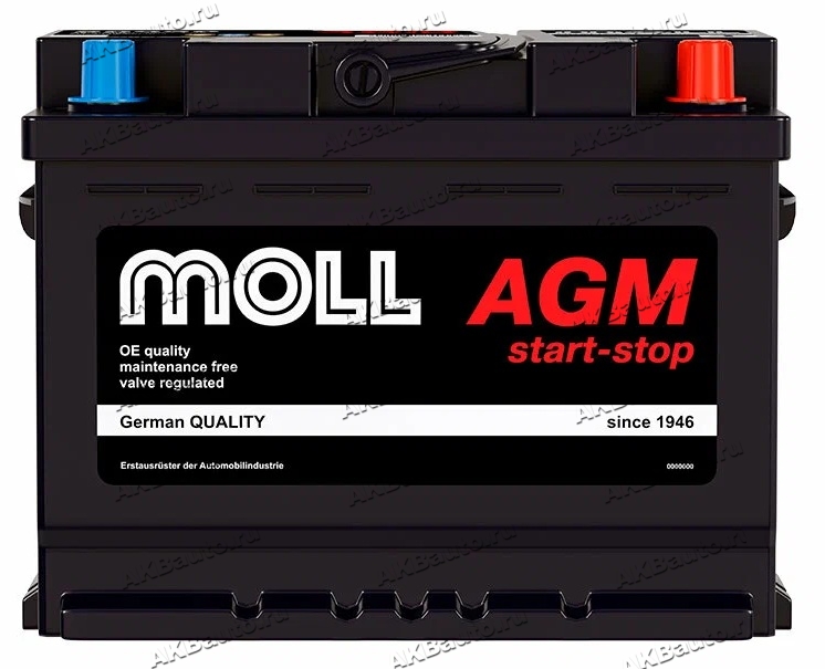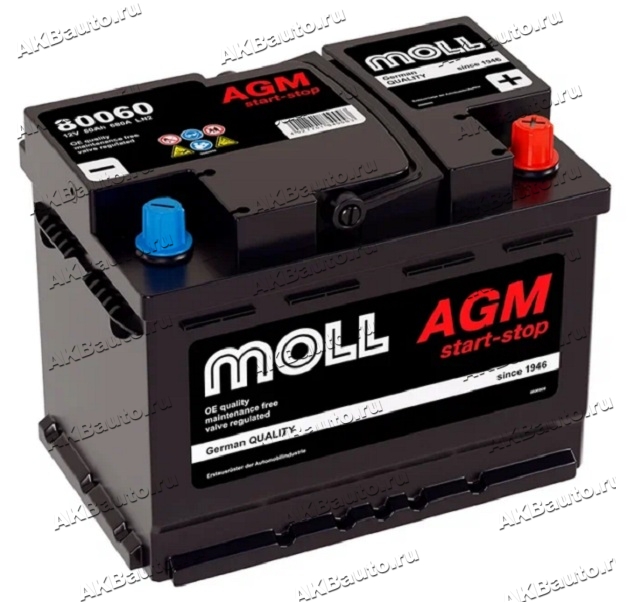 Стартерный автомобильный аккумулятор Moll AGM 60 А/ч предназначен для ряда европейских моделей машин. АКБ изготовлен по технологии AGM (электролит абсорбирован в стекловолокно), полностью необслуживаемый. Применяют при наличии системы Старт-стоп, Вебасто, увеличенном энергопотреблении.