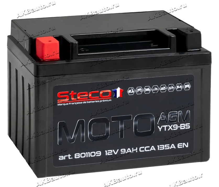 Аккумулятор для мотоцикла и скутера Steco AGM 12V 9 А/ч 135 А прям. пол. залит/заряжен 801109 (151х87х106) YTX9-BS
