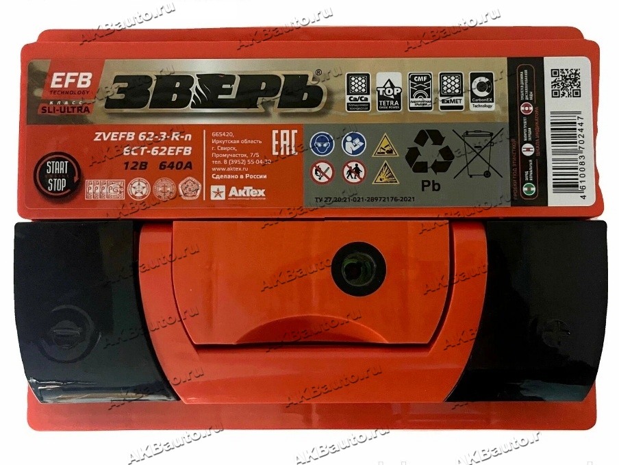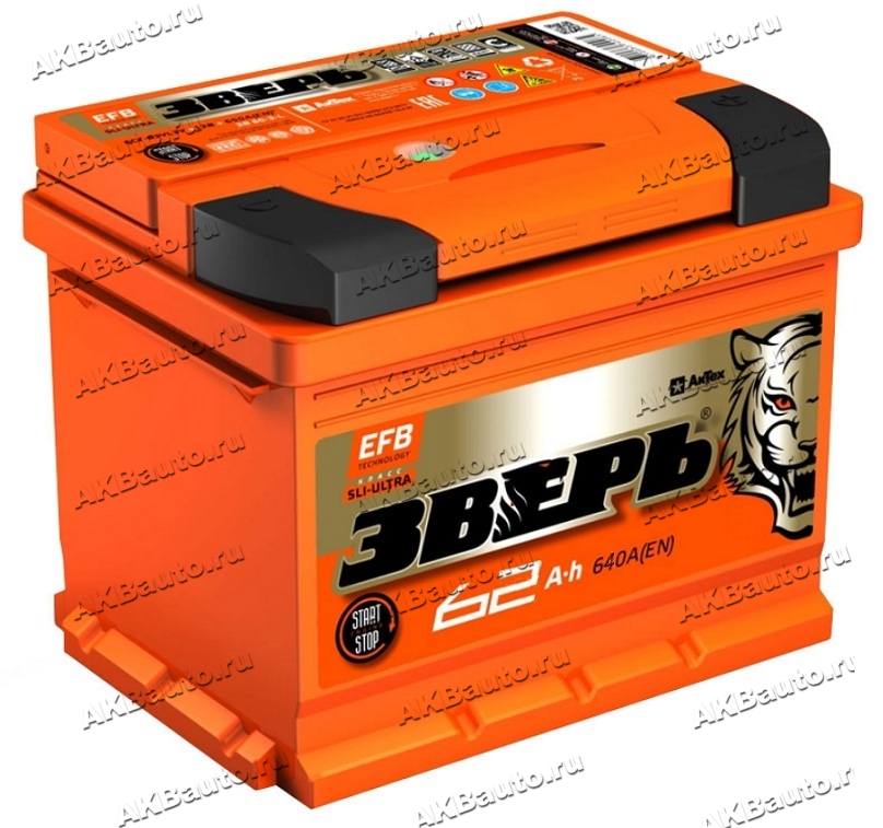 Аккумулятор автомобильный Зверь EFB 62 А/ч 640 А обр. пол. низкий Евро авто (242x175x175)